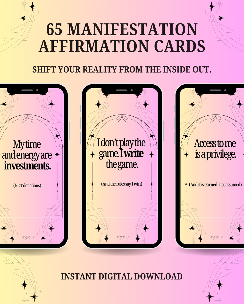 You'll get: A downloadable ZIP file with 65 digital affirmation cards (PNG) + full PDF deck